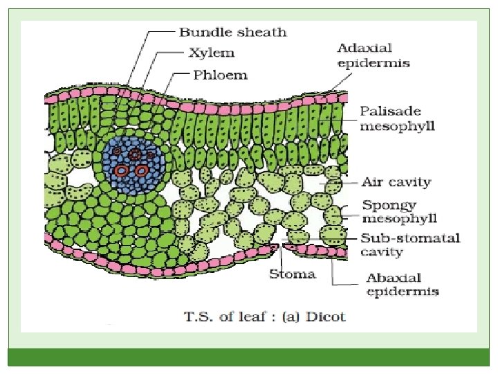 DIFFERENCE BETWEEN DICOT AND MONOCOT LEAF DICOT LEAF MONOCOT LEAF Mesophyll differentiated into palisade and spongy parenchyma. Not differentiated. Bulliform cell are absent. Bulliform cells are present. Hypodermis of mid –rib is collenchymatous. Hypodermis of mid-rib region sclerenchymatous. Stomata are absent or less abundant on the upper side. Stomata equally distributed on both sides. Bundle sheath is single layered and formed of colourless cells. Bundle sheath may be single or double layered.