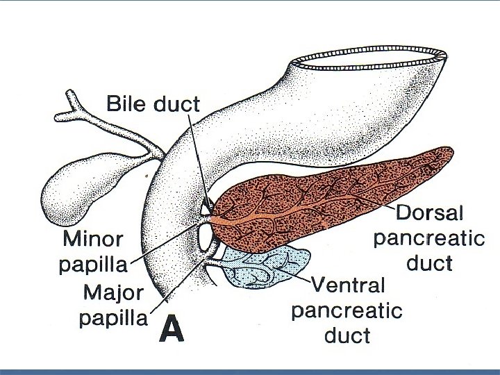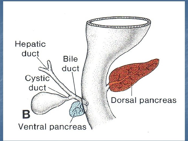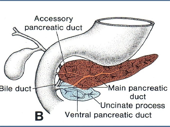 Development of Pancreatic duct n n Anastomosis between 2 ducts of the pancreatic buds. Definitive pancreatic duct is formed from: 1 - Duct of ventral bud which open in duodenum with common bile duct. n 2 - Anastomosis between 2 ducts. n 3 - Distal part of duct of dorsal pancreatic bud. n 4 - Proximal part of dorsal pancreatic duct may be obliterated or remain as accessory pancreatic duct. n