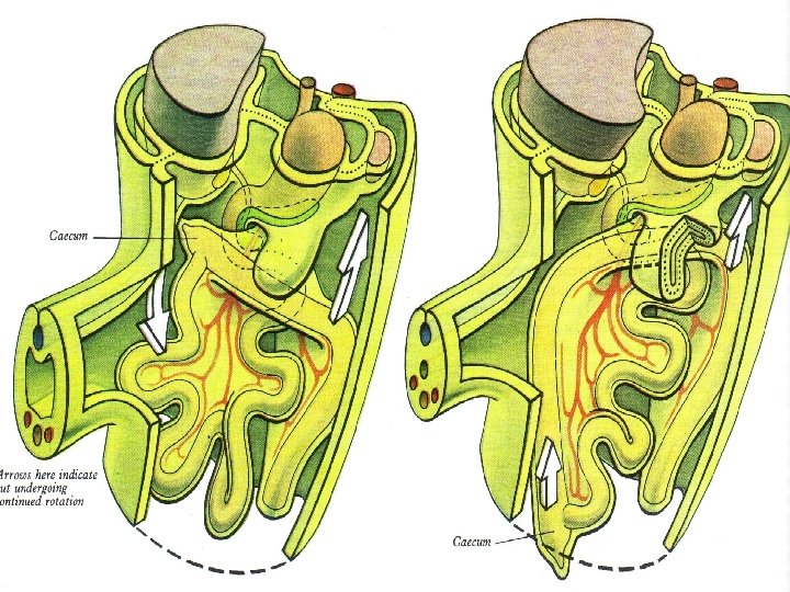 Development of Duodenum n n n Formation of duodenal loop (U-shaped), its cranial ½ belongs to foregut while its caudal ½ belongs to midgut. It gives origin to hepatic and pancraetic buds from its ventral wall in caudal end of foregut. It has dorsal mesoduodenum. It rotates 90 degrees to right with stomach till it rests on posterior abdominal wall with right convexity. Mesoduodenum becomes fused and absorbed to peritoneum of posterior abdominal wall, so it is retro peritoneal. Upper part of duodenum is supplied by coeliac artery, while its lower part by superior mesentric artery.