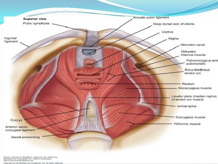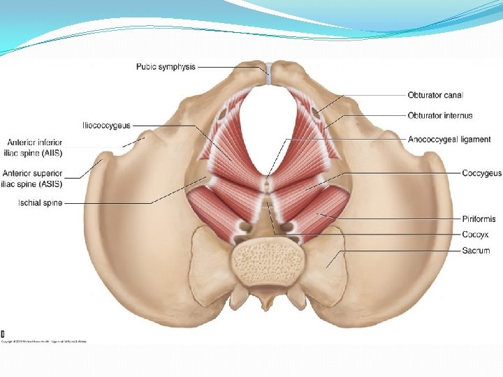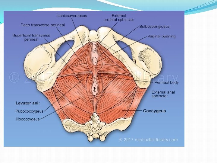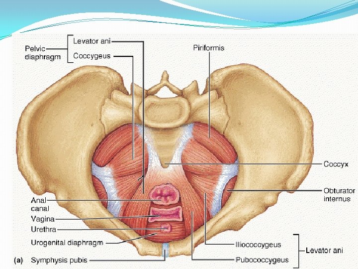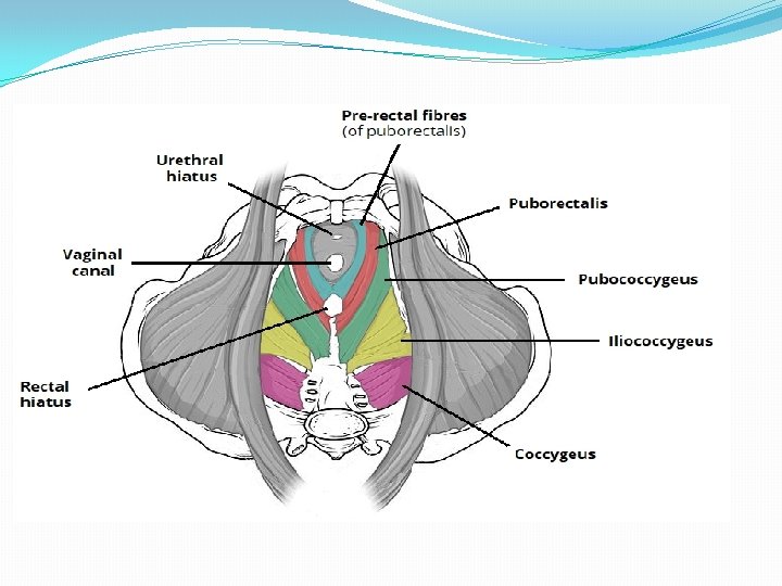 � Bilateral Strong muscle, fatigue resistant, striated muscle (voluntary) � Relaxed during evacuation of bowel and bladder (during bearing down effort) � Slug like hammock around pelvic organs. � Origin- from the back of pubic rami-pubococcygeus � from the condensed fascia covering obturator internus (white line)iliococcygeus � From the inner surface of ischial spine- Ischiococcygeus � Insertion. Pubococcygeus- post fibres into anococcygeal raphe (extends from anorectal junction to tip of coccyx)and tip of coccyx; puborectalisaround anorectal junction and form sling; puboanalis- run b/w sphincter ani externus and internus… inserted in wall of anal canal; pubovaginalis- form U shaped sling, ant fibres inserted into perineal body. Iliococcygeus- from white line, inserted into coccyx. Coccygeus- triangular in shape. Arises from apex of i. spine and sacrospinous ligament. Inserted into upper 2 pieces of coccyx and last piece of sacrum. Its fibres are not inserted into the bladder and urethra.