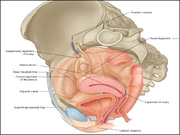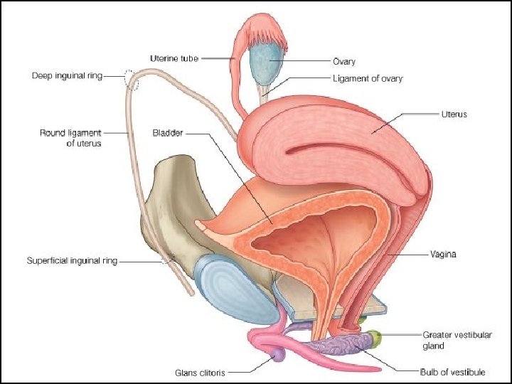 Contd. �Position- in nulliparous: vertical � in multiparous: horizontal �External features- before onset of ovulation: smooth surface � after puberty: puckered surface � 2 ends/poles- upper/tubal pole � lower/uterine pole � 2 borders- Ant. /mesovarian border � Post. /free border � 2 surfaces- medial & lateral