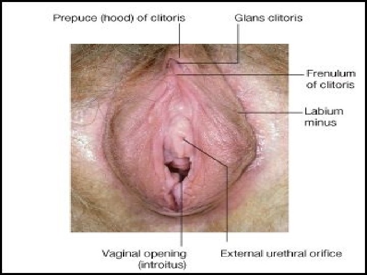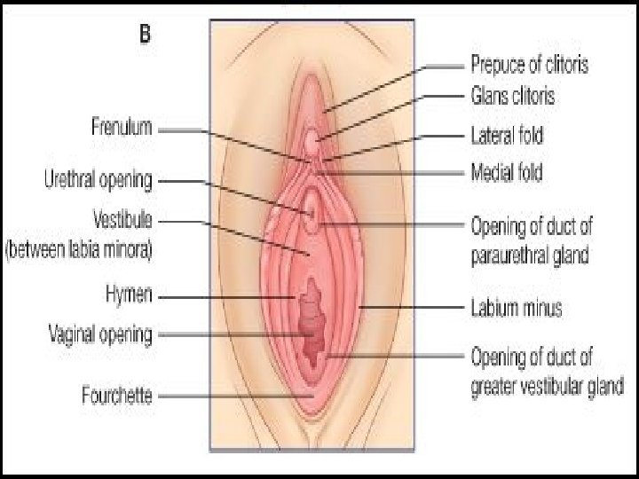 Vestibule �Meaning a forecourt or a hall next to entrance. �Bounded laterally by Hart line (demarcates changes in epithelium) and medially by hymenal ring. �Beyond Hart line the startified sqamous epithelium has a thin keratin layer. �Inside hart line, the epithelium is non keratinized. �Clinical correlation- important for choosing incision sites for Bartholin gland duct drainage or marsupialization ( inside the Hart line good) �Triangular space � 4 openings- (1) urethral opening � (2) vaginal orifice and hymen � (3) bartholin’s gland Urethral opening �Situated in midline �In front of vaginal orifice �Paraurethral ducts open here