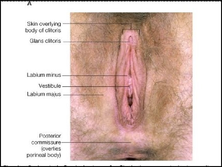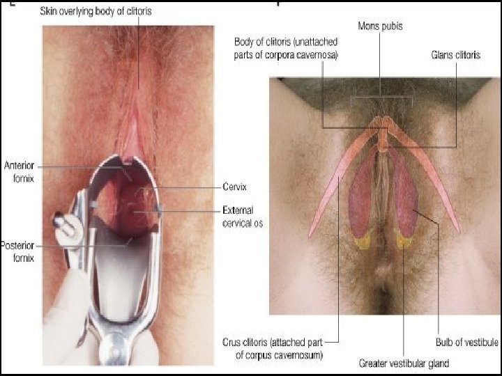 �Includes- External genitalia Mons pubis/veneris Labia majora Labia minora Clitoris Vestibule Perineum �Some gynecologists regard the perineum as part of vulva and many include under this term the perineal body (central tendon of perineum) as well as the overlying skin. �To Anatomist s , perineum means all structures within the bony outlet of the pelvis.
