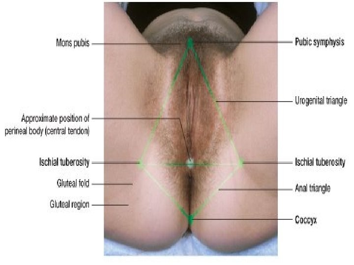 Anal triangle �No obstetric importance. �Terminal part of anal canal with sphincter ani externus, anococcygeal body, ischiorectal fossa, blood vessels, nerves, lymphatics.
