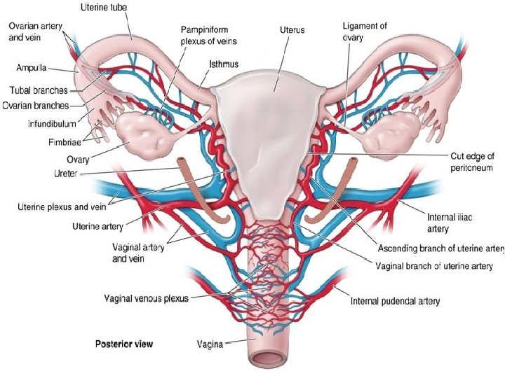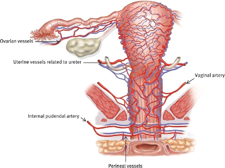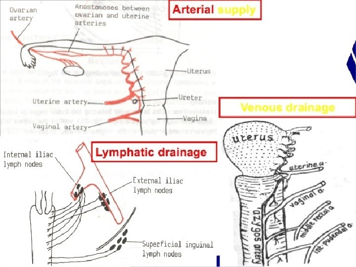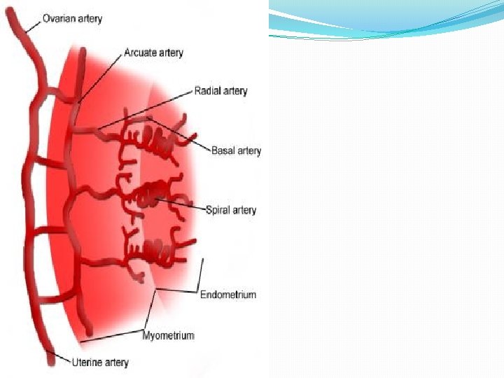 Contd. �Arcuate arteries arranged in a circular fashion in myometrium � � radial arteries(deep penetrate in myometrium) Straight arterioles spiral arteries � supply stratum basalis supply stratum functionalis in endometrium �Veins: - uterine veins drain into int. iliac veins