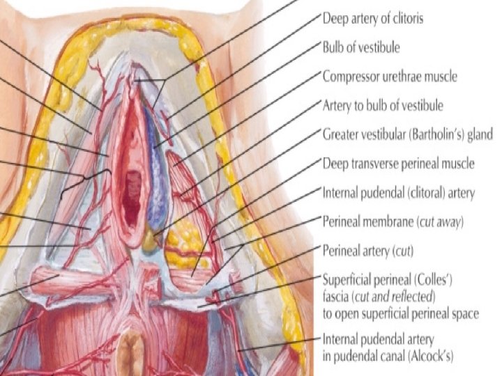 Contd. �The skin over the mons and L. majora contains hair and has a subcutaneous layer similar to that of abdominal wall. �The subcutaneous layer consists of a superficial fatty layer similar to Camper fascia and a deeper membranous layer called Colles fascia/Superficial perineal fascia (Scarpa Fascia of ant. Abdominal wall) �Clinical correlation- Colles fascia attaches firmly to the ischiopubic rami laterally and the perineal membrane posteriorly. These attachments prevent the spread of fluid, blood or infection from the superficial perineal space to the thighs or posterior perineal triangle. �Anteriorly Colles fascia has no attachments to the pubic rami and it is therefore continuous with the lower anterior abd wall, so spread of infection, fluid, blood between these compartments.