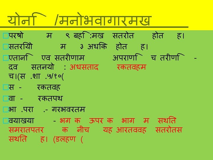 Avartha of Yoni �Yoni is that organ whose structure is compared with Shankha Nabhi i. e. Narrow below and broad above and also this structure is placed in such a manner i. e. it is seen like Concentric Circle that is called as Avartha. �These three Avartha of Yoni should be � 1. First Avartha should be Vagina: - It Starts from Vestibule to External Os. � 2. Second Avartha should be Cervix: - It starts from External Os to Internal Os. � 3. Third Avartha should be Uterus: - It starts from Inernal Os to Fundus of Uterus (Alpa. Muka and Anta Sushria) �Avarta also means rugae as told by Acharya Ghanekar.