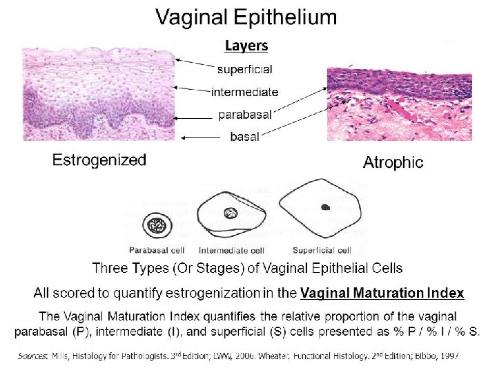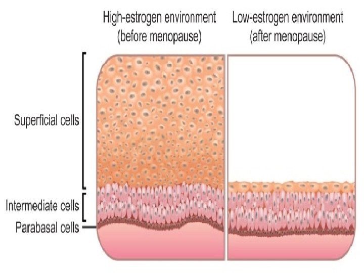 Contd. �Birthto 2 wks: maternal estrogen present, thick sq epithelium � 2 wks to prepuberty: no estrogen , thin epithelium �Puberty: estrogen appears , thick epithelium �Reproductive period: estrogen present, �Post menopause: again estrogen amount decreased, atrophy