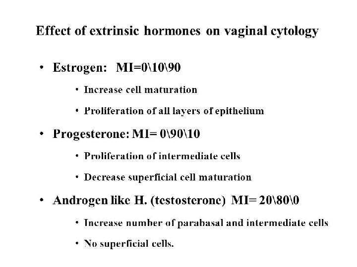 Contd. � 3 distinct layers are defined: (1) para Basal cells/Basal cells (2) Intermediate cells (3) Superficial cells contain glycogen under estrogen influence lactic acid �Glycogen {Doderlein’s bacilli} maintain vaginal p. H [4 - 5. 5]