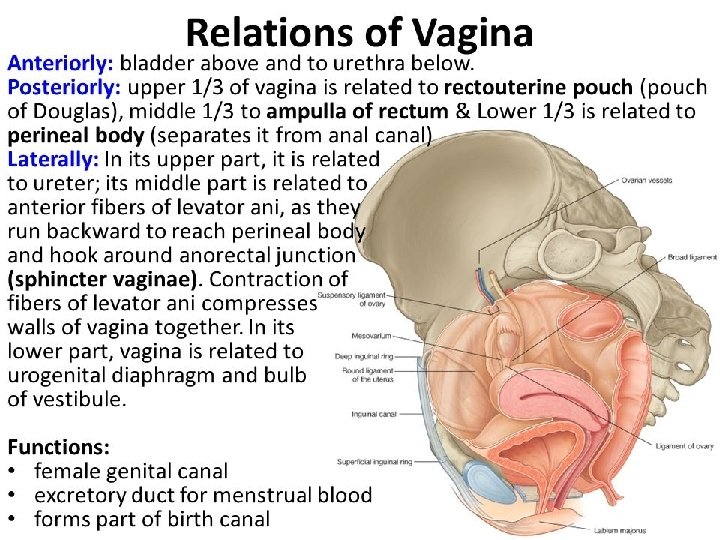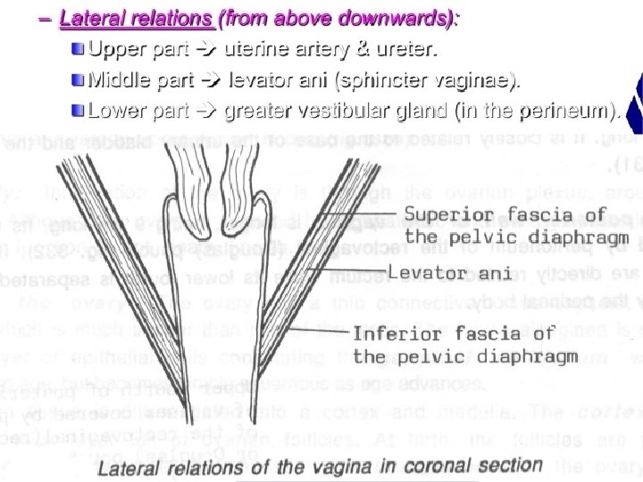 VAGINA �Means sheath, fibromusculomembranous sheath. �Hollow viscus, Communicating the uterine cavity with exterior at vulva. �Excretory channel �Organ of copulation �Forms the birth canal �Forming an angle of 45* with the horizontal �Long axis of vagina parallel to the plane of inlet �Canal diameter-2. 5 cm, distensibility power due to rugae.