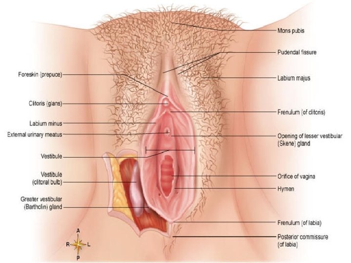 Applied part �Secondary sexual characters- Pubic hair growth �Vulval defence �Round ligament fibroid �Bartholin cyst/abscess-marsupilisation �Clitoromegaly �Congenital anomalies-cryptomenorrhoea �Episiotomy �Clitoris may be absent, may be bifid or may be double. It may be enlarged in hermaphroditism (adrenogenital syndrome/CAH) �Labia minora may show partial fusion. �Urethra may open on the anterior wall of vagina, this is the female equivalent of male hypospadias.