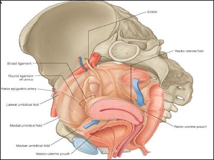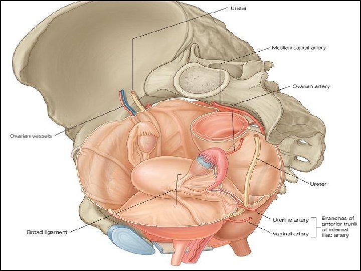 Relations �Ant. - Above the internal os- uterovesical pouch Below the internal os- separated from base of bladder by loose areolar tissue. Post. - POD Laterally- Broad ligament- in which uterine artery ascends Mackenrodt’s ligament- extends from internal os, supravaginal cervix, lateral vaginal wall. About 1. 5 -2 cm away at the level of internal os, a little nearer to left side is the crossing of uterine artery and ureter (bridge over water).