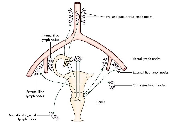Lymphatics of cervix �Primary group� 1. sacral nodes � 2. external iliac � 3. internal iliac � 4. obturator � 5. parametrial �Secondary Group- the lymphatics from all primary groups drain into common iliac and superior lumbar group.