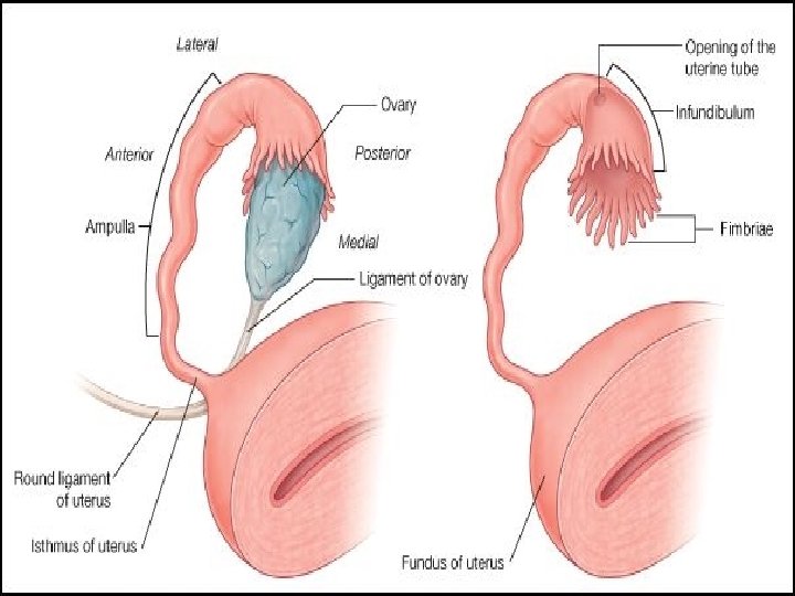 Fallopian tube � 10 cm long, Oviducts and ovary constitute adnexa. � 2 openings Uterine (1 mm) � 4 parts Pelvic opening (2 mm) Isthmus (2. 5 cm) Infundibulum (1. 25 cm) Ampulla (5 cm) Interstitial(1. 25)
