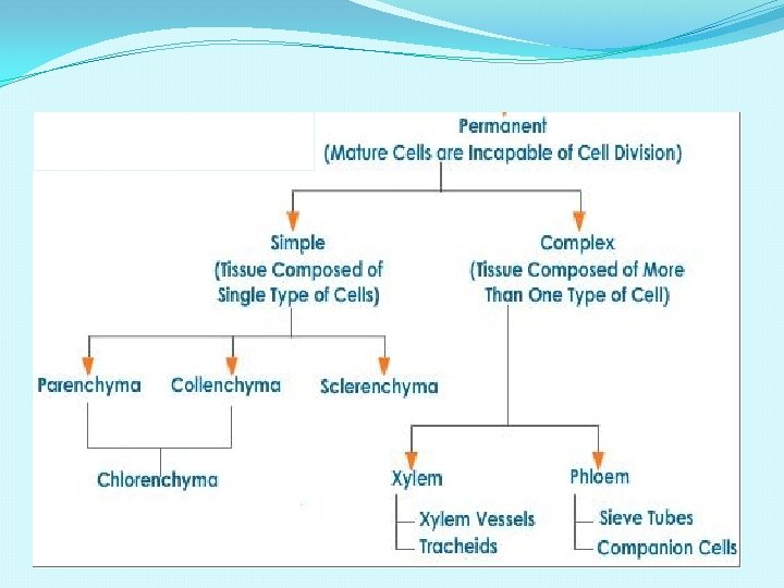 Permanent tissues - formed from meristematic tissues - tissues that attained their mature form and perform specific functions - they stop dividing Types: Simple permanent tissues Complex permanent tissues