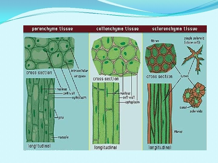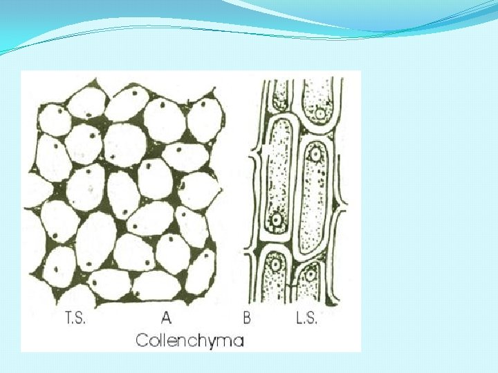 2. Co. IIenchyma - Greek word kolla which means “glue” - cells are elongated (up to 2 mm long) with unevenly thickened walls ( thin on the sides but thick at the angles where 2 or more cells meet) - differentiates from parenchyma cells & are alive at maturity Functions: Provides mechanical Support – to the growing parts of the plant