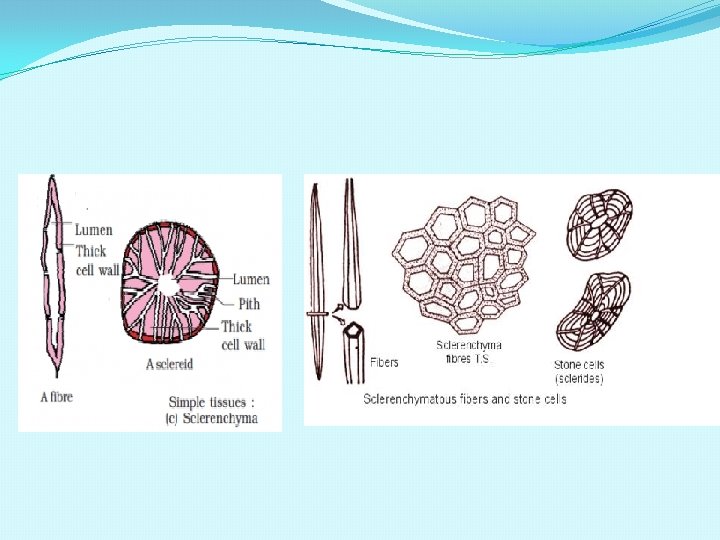SCLERENCHYMA CELLS SCLEREIDS(STONE CELLS): a)These are oval or spherical in shape and have very thick walls with a narrow lumen. b) Occurs in the shells of nuts and in the pulp of fruits of pear , guava and sapota, making them gritty. FIBERS: a)These are elongated and thick walled cells with tapering ends. b)Fibers are present in xylem, phloem and also in cortex and pericycle.