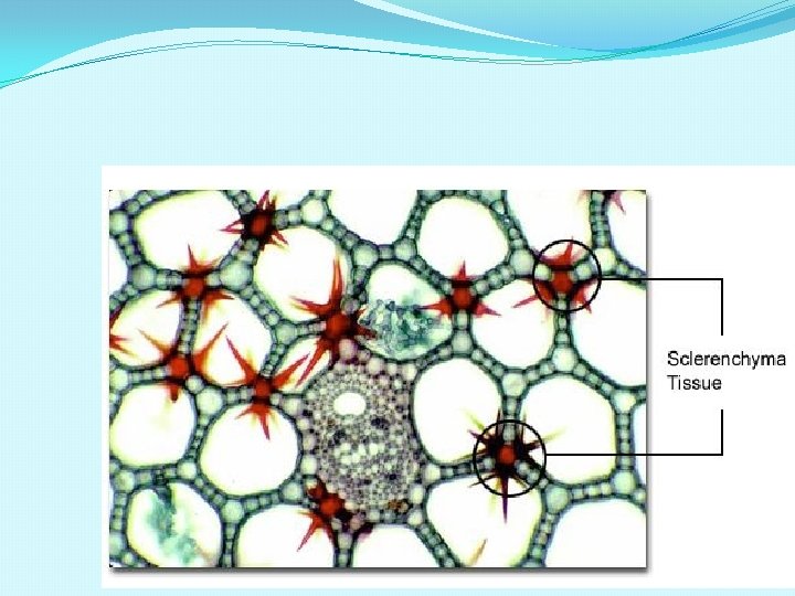 SCLERENCHYMA Long narrow cells with thick & lignified cell walls with few or more pits. Dead cells without protoplast. Cell may be either fibres or sclereids. Fibres occur in groups, thick walled, elongated and pointed cells. sclereids are spherical or oval highly thickened cells with very narrow lumen , found in nuts wall & fruit pulps. Function-mechanical support to organs.