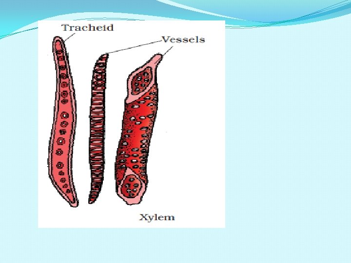 FUNCTIONS OF XYLEM TRACHIEDS-main water conducting tissue of angiosperm and gymnosperm. VESSELS-main water transporting element of angiosperm. XYLEM PARENCHYMA-store food & other substances like tannins and conducts water Radially. XYLEM FIBRES -Provides mechanical strength to plants.