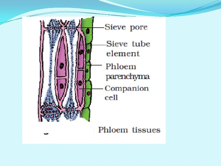 PHLOEM ELEMENTS SIEVE TUBE-long, tube like, associated with companion cells, lacks nucleus. COMPANION CELLS-specialised parenchyma, closely associated with sieve tube, nucleated. PHLOEM FIBRES(BAST FIBRES)sclerechymatous thick walled dead cells. e; g jute, flax, hemp. PHLOEM PARENCHYMA-elongated , cylindrical , nucleated cells having pits.