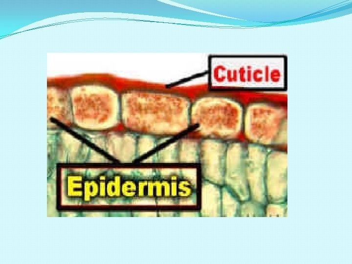 EPIDERMAL TISSUE SYSTEM v. Consists of epidermal cells, stomata & epidermal appendages such as trichomes and root hair. v. Epidermis-single layered, compactly arranged cells. v. Cuticle- the waxy layer sometimes cover epidermis. Cuticle checks water loss. v. Root hair-unicellular, absorb water & minerals. v. Trichomes-multicellular, branched or unbranched present in shoot system. prevent loss of water.