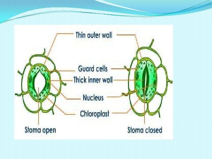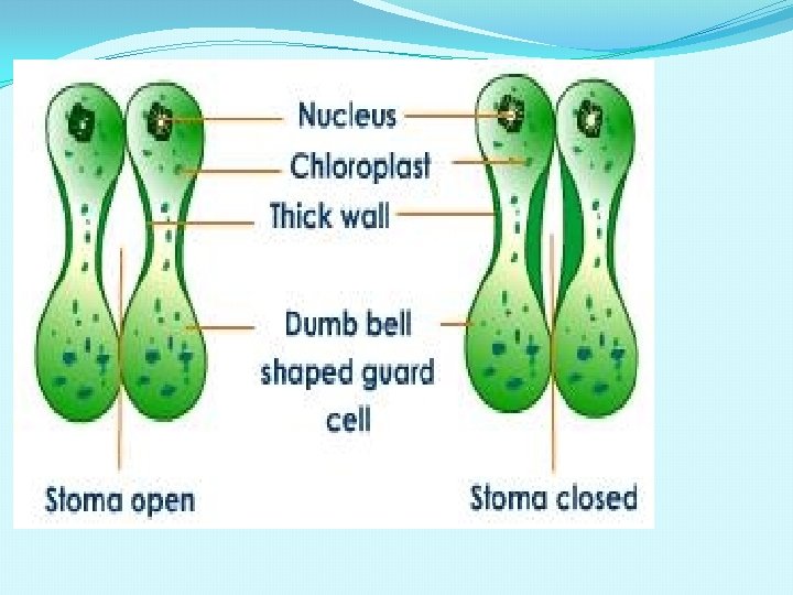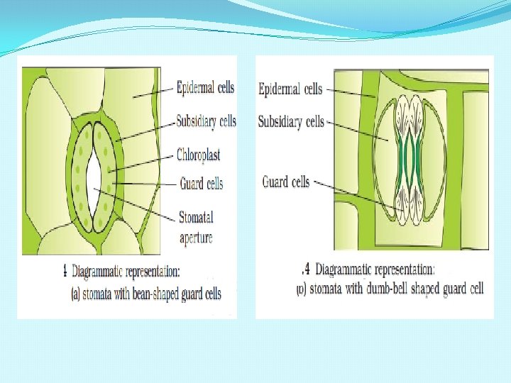 STOMATA �Each stoma surrounded by two guard cells; they regulate opening and closing of the stoma for transpiration and exchange of gases. �Guard cells are bean shaped in dicots and dumb bell shaped in monocots. �Outer wall of guard cell is thin and inner wall is thick. �Guard cell have chloroplast and carry out photosynthesis. �Epidermal cells in vicinity of guard cell become specialised in their size and shape and are called subsidiary cells.