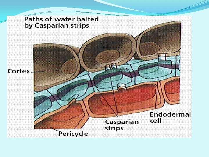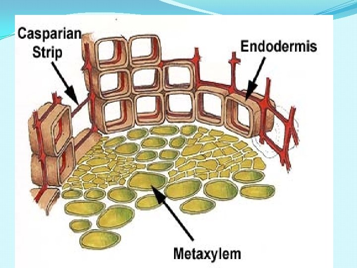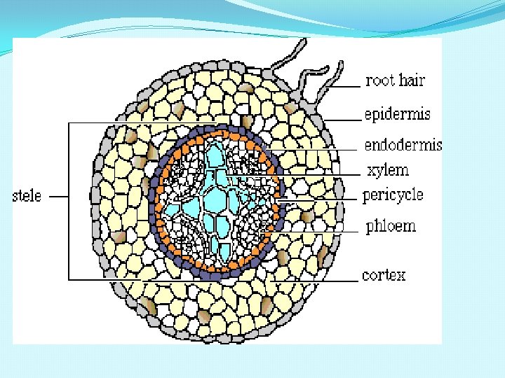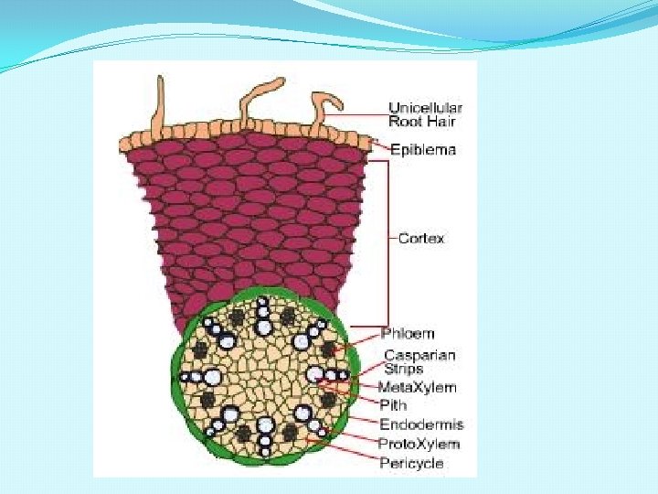 ANATOMY OF MONOCOT ROOT �EPIDERMIS: �Single layer of compact cells �Unicellular hairs �Cuticle absent. �CORTEX: �Made of several layers of parenchyma. �Stores large amount of starch grains. �Cells with intercellular spaces. �ENDODERMIS: �Inner most layer of cortex. �Well developed casparian strips on their tangential and radial walls. �Endodermal cells opposite to the xylem groups do not have casparian strips and such cells are called passage cells.