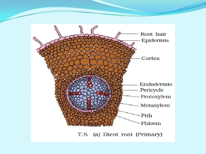 T S OF DICOT ROOT epidermis cortex phloem Vascular cambium xylem pericycle endodermis