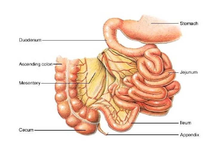 Ileum • Part of the small intestine beyond the jejunum and up to to the ileocecal valve i. e. before the colon(large intestine). • The wall itself is made up of folds, each of which has many tiny finger-like projections known as villi on its surface. – The function of the ileum is mainly to absorb vitamin B 12 and bile salts and whatever products of digestion were not absorbed by the jejunum.