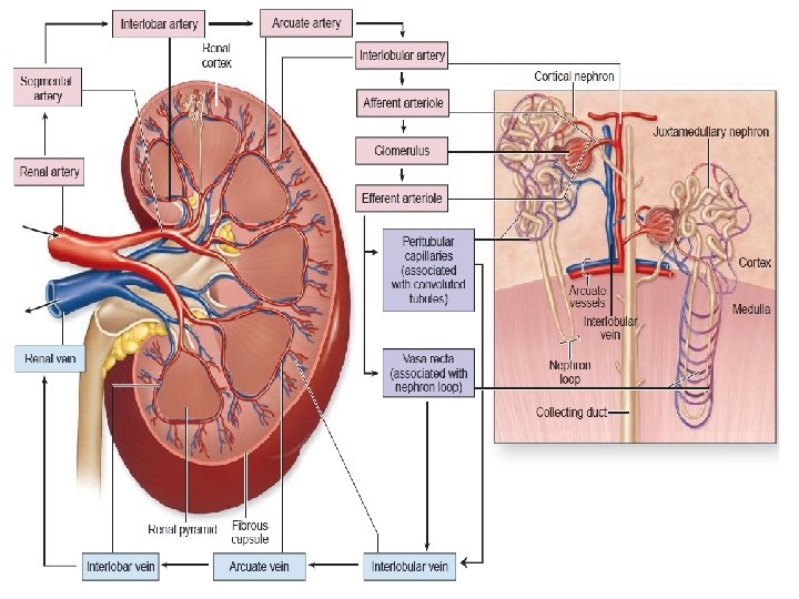 Blood Supply • Abdominal aorta • Renal artery • Inferior vena cava • Segmental arteries • Renal vein • lobar arteries • Interlobar veins • Interlobar arteries • Arcuate veins • Arcuate arteries • Interlobular veins • Interlobular arteries