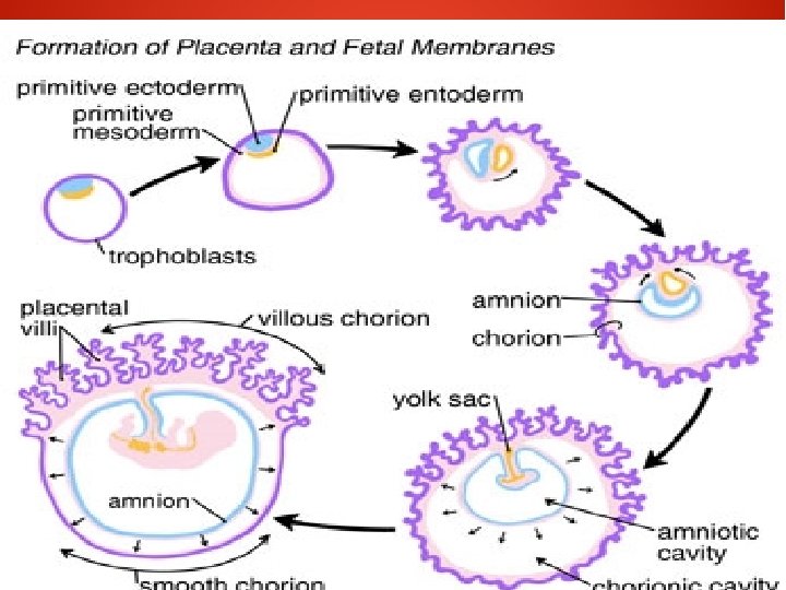 Development of membranes and formation of amniotic fluid ● ● ● ● On the 8 th and 9 th postovulatory day Endoderm Ectoderm Amniotic cavity Primary yolk sac Parietal extra embryonic mesenchyme Visceral extra embryonic mesenchyme