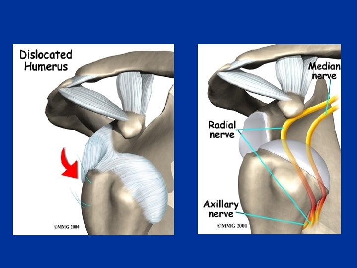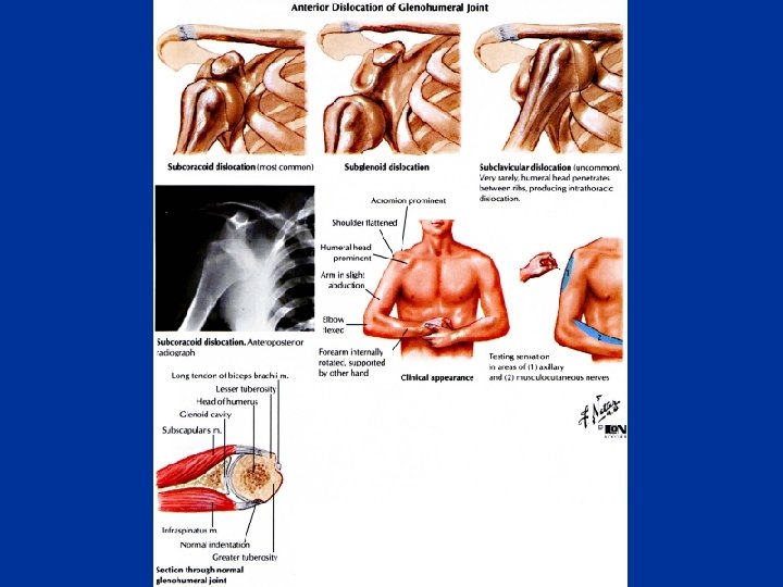 Dislocation of the Glenohumeral Joint n Because of its freedom of movement and instability, the glenohumeral joint is commonly dislocated by direct or indirect injury. n Most dislocations of the humeral head occur in the downward (inferior) direction 1. 2. the presence of the coracoacromial arch the support of the rotator cuff n Anterior or posterior dislocations n Posterior dislocations account for only 2 -3% of shoulder dislocations