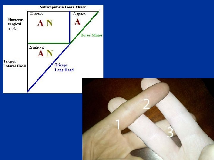 Triangular space n n an area of communication between the axilla and the posterior scapular region formed by: – the medial margin of the long head of triceps brachii – the superior margin of teres major – the inferior margin of teres minor The circumflex scapular artery and vein pass through this gap