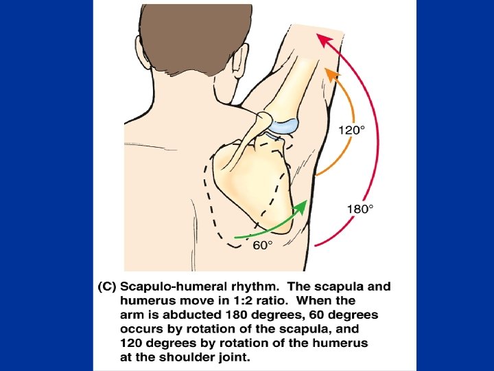 n n The supraspinatus initiates abduction and the deltoid takes over once the humerus is abducted past 15 degrees During full abduction of the arm we have to laterally rotate our humerus to move the greater tuberosity out of the way. n Even with this maneuver, space is too limited to allow for the range of motion that is seen in a normal individual. n The remainder of the range of motion is made possible by scapular rotation. n Once we have abducted the arm past 20 degrees or 30 degrees, for every 3 degrees of abduction at the glenohumeral joint, 1 degree occurs at the scapulothoracic surface and only 2 degrees occurs at the glenohumeral joint.