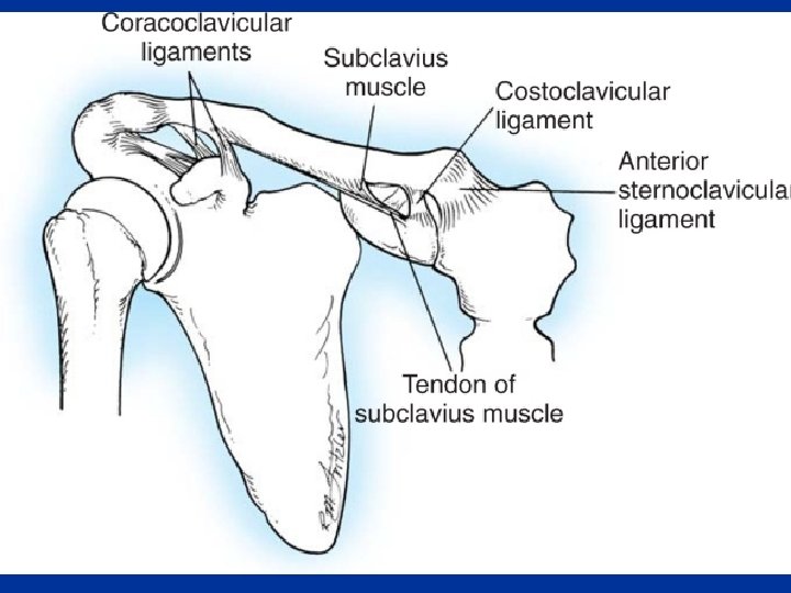 The coracoclavicular ligament ü The strength of the AC joint depends on the strong coracoclavicular ligament ü provides the means by which the scapula and free limb are (passively) suspended from the clavicular strut üA greater part of the body weight is transmitted through it ü The rotatory movements of the scapula occur at this important ligament ü As long as the coracoclavicular ligament is intact, the acromion cannot be driven inferior to the clavicle. ü The ligament, however, does permit protraction and retraction of the acromion