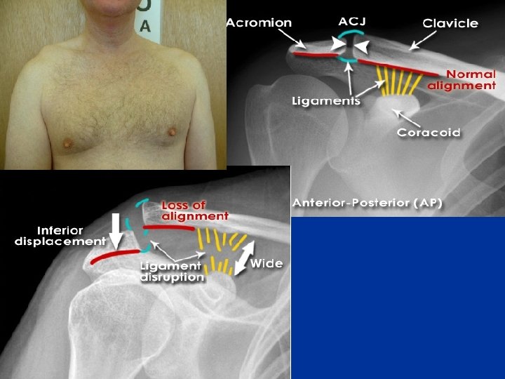 Dislocation of the AC Joint "shoulder separation" n n n The AC joint itself is weak and easily injured by a direct blow. In contact sports it is not uncommon for dislocation of the AC joint to result from a hard fall on the shoulder or from a fall on the outstretched upper limb. The AC injury, often called a "shoulder separation" When the coracoclavicular ligament tears, the shoulder separates from the clavicle because of the weight of the upper limb. Rupture of the coracoclavicular ligament allows the fibrous capsule of the joint to also be torn so that the acromion can pass inferior to the acromial end of the clavicle Dislocation of the AC joint makes the acromion more prominent, prominent and the clavicle may move superior to this process