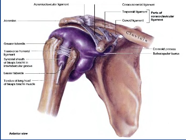 Articular Capsule of the Glenohumeral Joint n The loose fibrous capsule surrounds the glenohumeral joint n Attached medially to the margin of the glenoid cavity and laterally to the anatomical neck of the humerus n Superiorly, the articular capsule encroaches on the root of the coracoid process so that the fibrous capsule encloses the proximal attachment of the long head of the biceps brachii (supraglenoid tubercle of scapula ) within the joint.