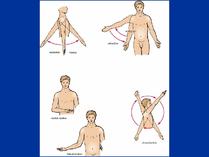 Movements of the Glenohumeral Joint n The glenohumeral joint has more freedom of movement than any other joint in the body. n This freedom results from: 1. 2. n The glenohumeral joint allows movements around three axes and permits: 1. 2. 3. 4. n the laxity of its articular capsule the large size of the humeral head compared with the small size of the glenoid cavity. Flexion-extension Abduction-adduction Rotation (medial and lateral) of the humerus Circumduction is an orderly sequence of flexion, abduction, extension, and adduction or the reverse.
