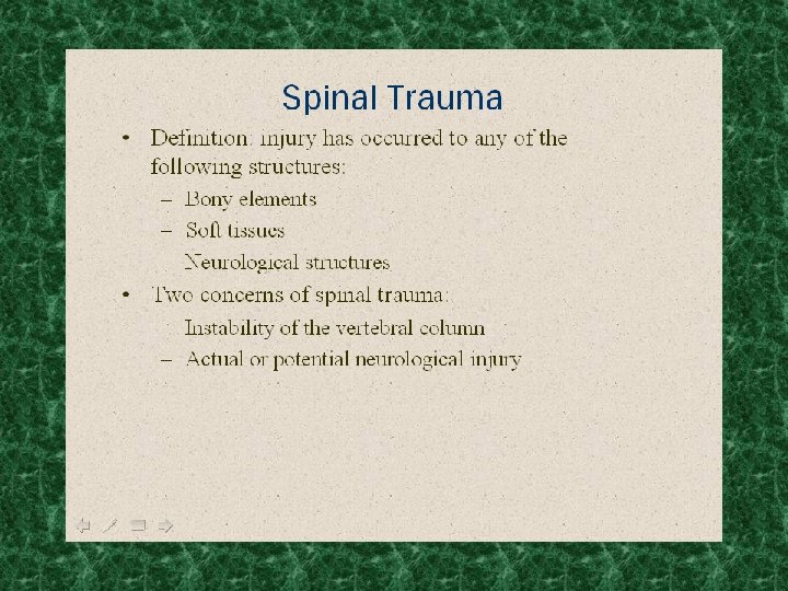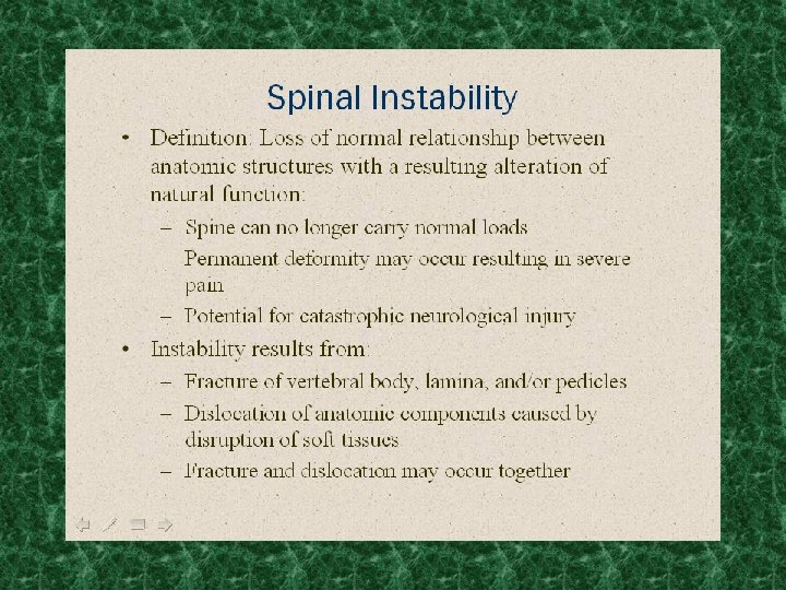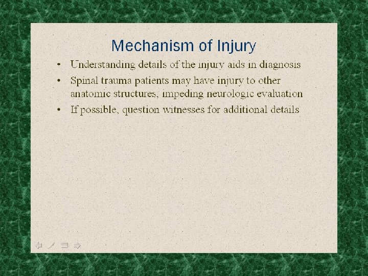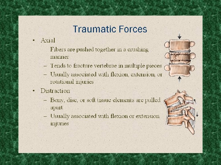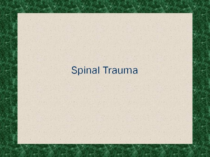 Dx • Examination: During examination move the patient as a single piece. • 1 -bruising in the head. 2 -spinous processes gap. 3 -penetrating injury. 4 -deformity. 5 - sever tenderness.