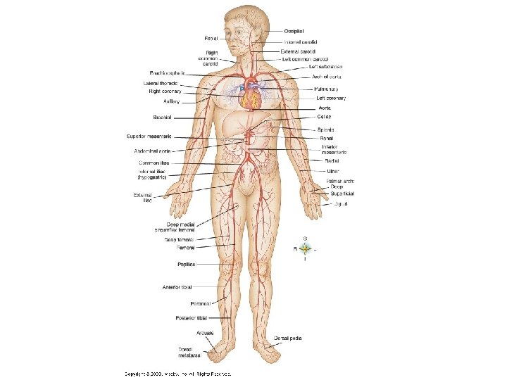 Systemic Arteries • • Arch of aorta Subclavian (L and R) Brachiocephalic common carotid (L and R) Axillary (L and R) Brachial (L and R) Radial Ulnar • • Abdominal aorta Common iliac External iliac Femoral Popliteal Posterior tibial Anterior tibial Dorsal pedis