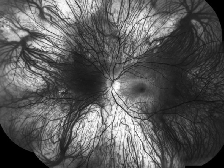 Example of both retinal vessels and choroidal vessels (choroidal markings) easily visible (A red-free photograph, that makes blood appear “black” is a patient with an extremely thin retina) (also great example of vortex veins!)