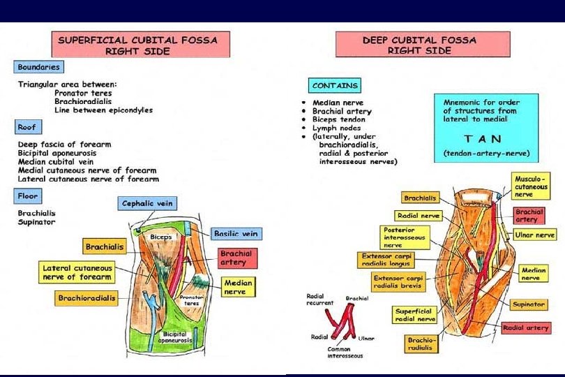 Cubital Fossa venous layer 1 cephalic vein 2 basilic vein 3 median cubital vein Aponeurotic layer 1 bicipital aponeurosis 2 biceps tendon artery-nerve layer 1 brachial artery 2 median nerve muscular floor 1 supinator 2 brachialis 3 biceps tendon