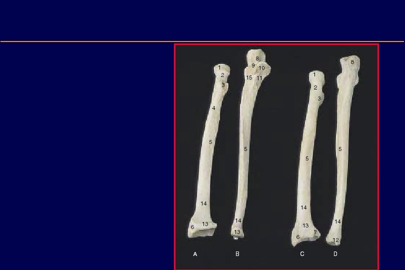 • • A. Right radius B. Right ulna C. Left radius D. Left ulna – – – – 1. Proximal head 2. Neck 3. Radial tuberosity 4. Anterior oblique line 5. Interosseous border 6. Styloid process of radius 7. Ulnar notch 8. Olecranon process 9. Trochlear notch 10. Coronoid process 11. Ulnar tuberosity 12. Styloid process of ulna 13. Distal head 14. Distal neck 15. Radial notch