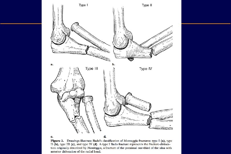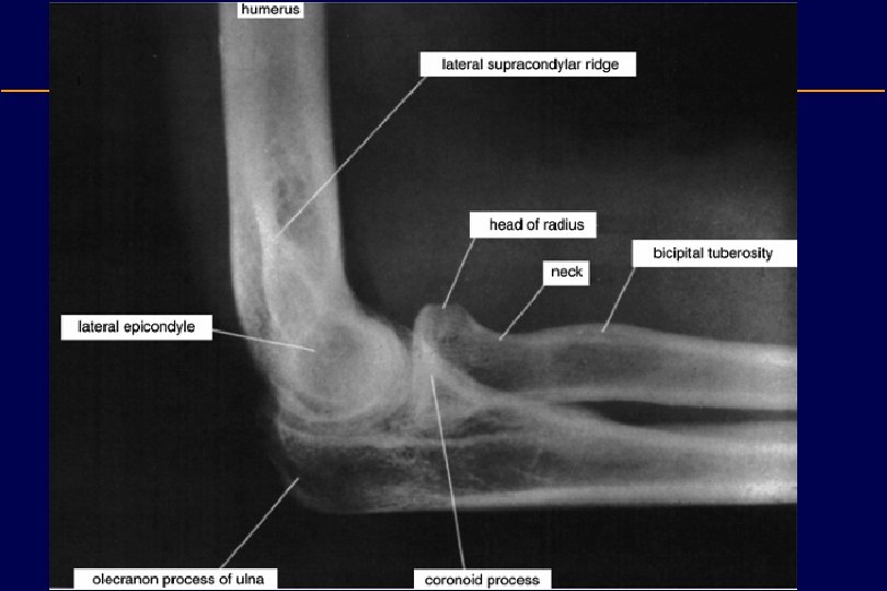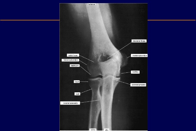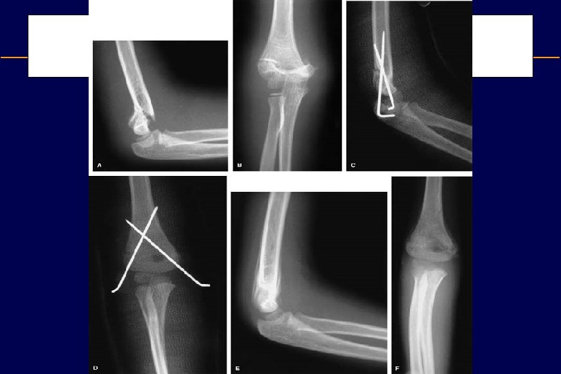 Olecranon Fractures • Fracture of the olecranon commonly occur with a direct blow or as an avulsion injury with triceps contracture • The fractures generally are transverse or oblique in orientation and enter the trochlear notch.
