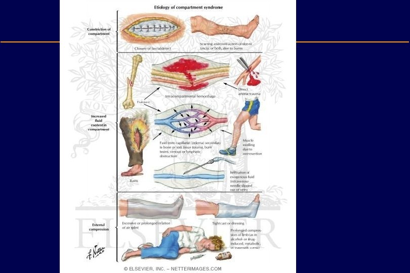 Compartment Syndrome • TRUE ORTHOPEDIC EMERGENCY • A condition characterised by raised pressure within a closed space with a potential to cause irreversible damage to the contents of the closed compartment • Leads to muscle ischemia and necrosis. • Compartment syndrome may result from » » » A fracture A soft-tissue injury An arterial injury causing ischemia, necrosis, and edema A burn By external compression from immobilization