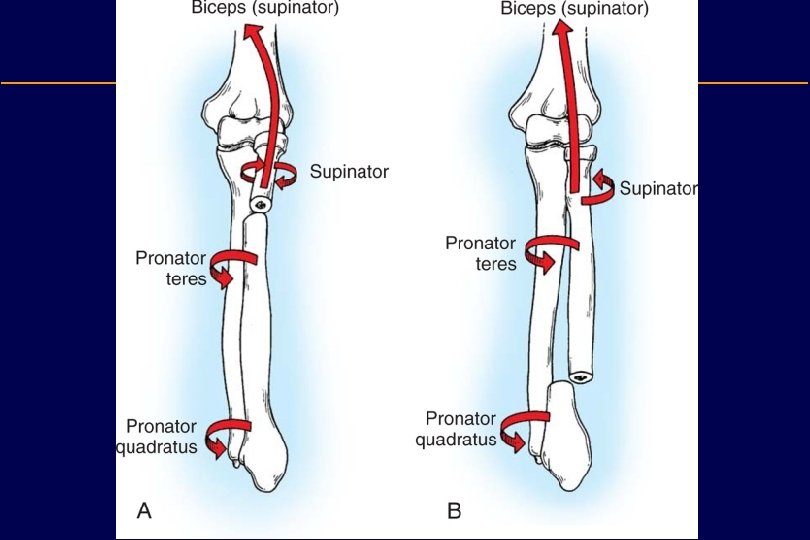 Radial Fracture • Radius fracture proximal to the insertion of pronator teres muscle – The supinator and biceps brachii muscles supinate the proximal fragment and draw it laterally. – The pronator teres and pronator quadratus muscles pronate the distal fragment and draw it medially.