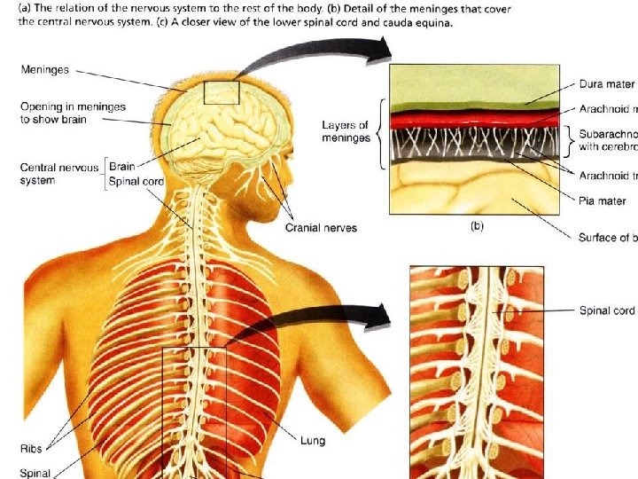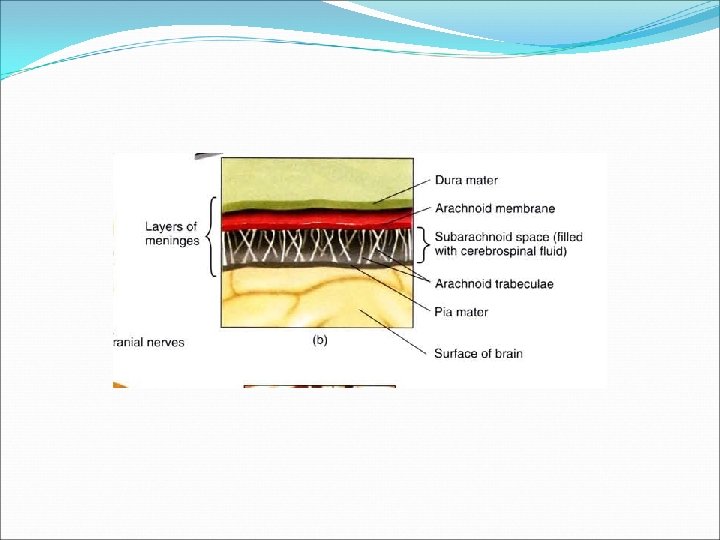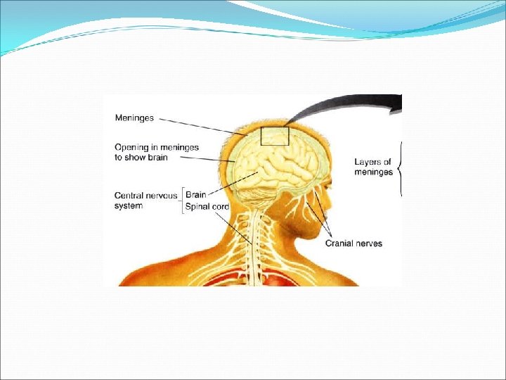 Protection of the Central Nervous System �Bony Protection �Skull and vertebral column �Meninges �Dura mater – “tough mother” � Epidural space – place for injecting anesthesia �Arachnoid membrane – spiderweblike membrane � Subarachnoid space – contains large blood vessels and cerebrospinal fluid �Pia mater – “pious mother” – delicate membrane adheres to the surface of the CNS