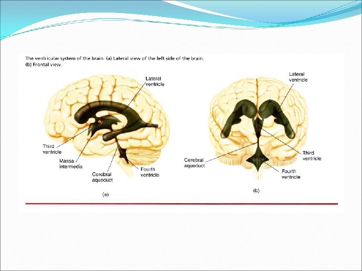�CSF �Block to its flow – maybe due to tumor near one of the channels �Build up of fluid in the ventricles causing pressure on the walls of the ventricles and on the brain �Hydrocephalus – in children with enlargement of the head, in adults with pressure on the brain tissue �Treated by draining the excess fluid and trying to remove the obstruction