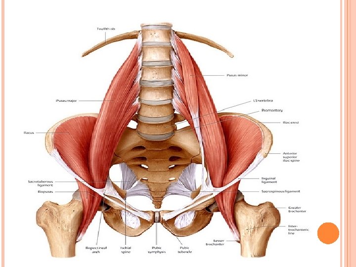 BONY ANATOMY OF THE PELVIS Pelvis is formed by 2 pairs of 3 fused bones: the Ilium, Ischium, and Pubis. These 2 sets of innominate bones are joined anteriorly by the pubic symphysis The sacrum fixates the spinal column to the spinal cord, and is responsible for stabilizing the pelvis The acetablum face down and out depression in the bone that accepts the head of the femur within its fossa The labrum is a thick ring of fibrocartilage that lines the acetabulum and deepens the acetabulum by approx. 21%. The labrum is thicker/stronger superiorly than inferiorly