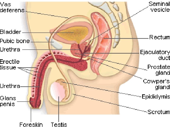 SEMINAL GLANDS § Each seminal gland (vesicle) is an elongated structure that lies between the fundus of the bladder and the rectum. § The seminal glands are obliquely placed superior to the prostate and do not store sperms, as the “vesicle” term implies. § They secrete a thick alkaline fluid with fructose (an energy source for sperms) and a coagulating agent that mixes with the sperms as they pass into the ejaculatory ducts and urethra.